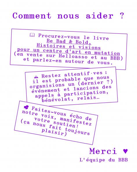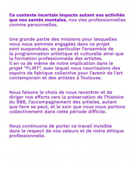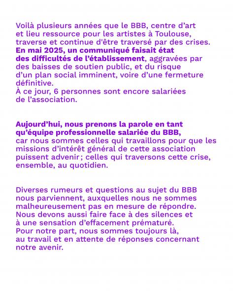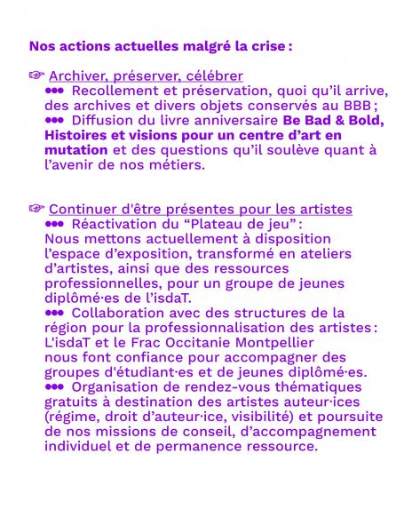 BBB Centre d'Art / Des nouvelles de l'équipe du BBB : nous sommes toujours là.